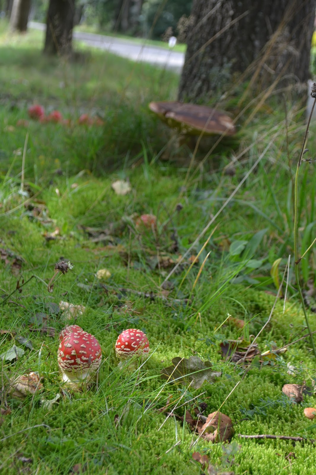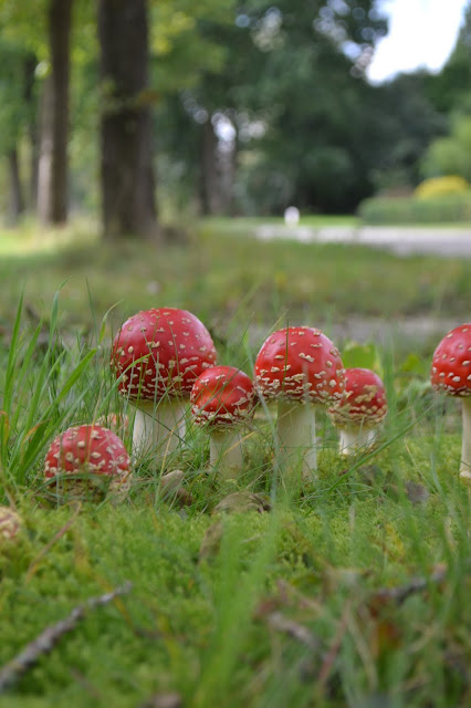 Op weg naar huis, zo tussen een vergadering, een boodschapje en een wasmachine door zag ik ze ineens. In een ooghoek. Zo mooi! Net alsof iemand ze geboetseerd had en zorgvuldig neergezet, vel afstekend tegen het knalgroene mos. Blijkbaar was al die regen ook nog ergens goed voor.