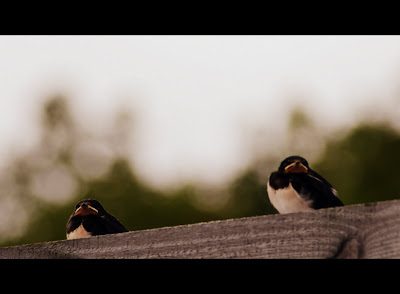 Aan de roodbruine keeltjes te zien zijn het boerenzwaluwen. Papa of mama voerde vervaarlijk snelle duikvluchten uit boven mijn hoofd toen ik zijn kroost op de foto zette. Duidelijk niet gediend van paparazzi.