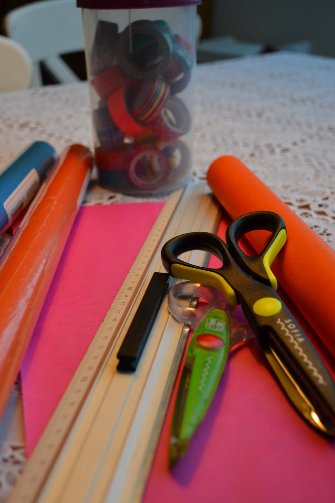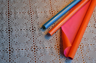 De vrolijke kleurtjes van het pakpapier maken blij! En bij de Hema vond ik lint in precies de bijpassende kleuren. Eerst zette ik de kaartjes en lintjes met grote knijpers vast, maar dat was me toch te grof. Dus heb ik kleinere bij de Blokker gevonden.