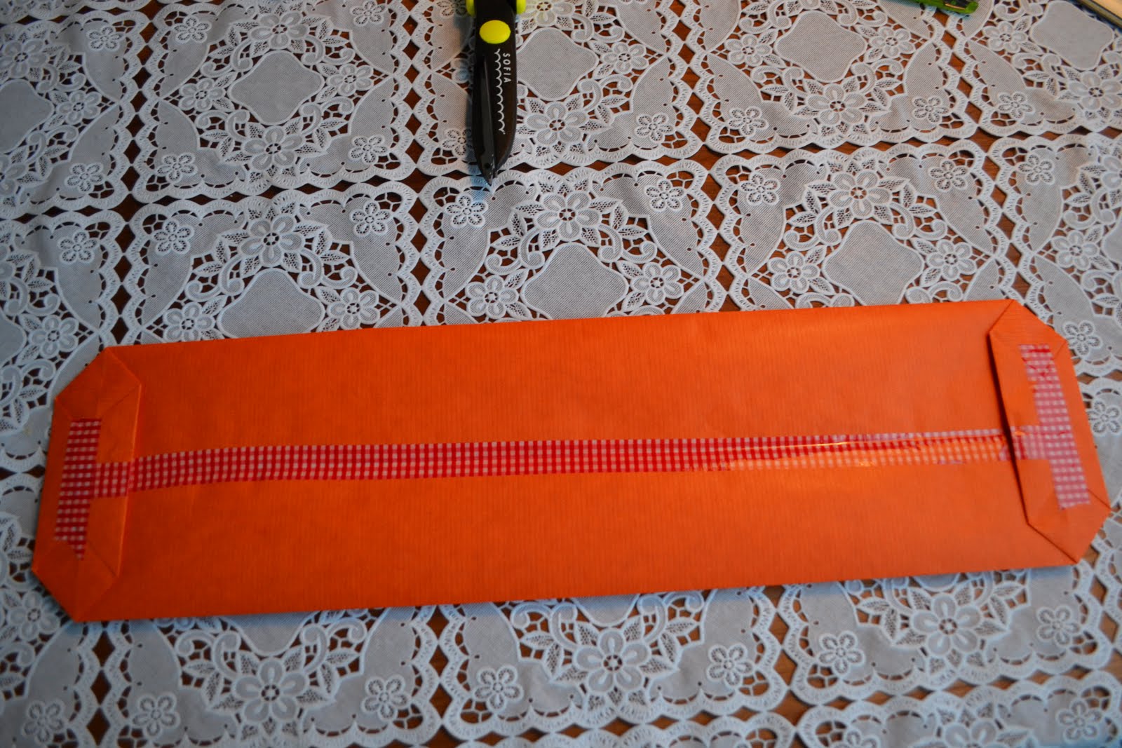 Het mooie tweekleurige pakpapier is precies goed voor dit doel. Ik bestelde het bij  Lobbes gewoon met de houten figuurtjes mee. Uit de breedte van het pakpapier kon ik precies twee zakjes halen, dat werkte wel zo snel. Ik knipte dus stukken van 25x50 cm.