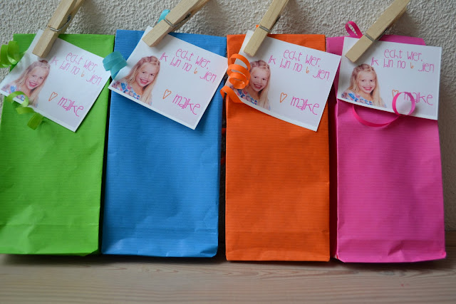 Nu was ik zelf de afgelopen dagen een flinke 'pûdsjeplakker'. Niet omdat ik er niks van bakte, in tegendeel, ik raakte zeer bedreven in plakken van pûdsjes, oftewel: zakjes. Met reden: Prinses wordt prin-zes! En daar hoort natuurlijk een traktatie bij. Nu wilde ik mij er maar wat 'gemakkelijk' af maken, door kant en klare houten figuurtjes te kopen. Maar het liep spaak op de verpakking. Ik wilde papieren zakjes. En nog leuke ook. En dat werd of duur, of veel (vanaf 250 stuks). En om nou 8 jaar lang ieder jaar op dezelfde papieren zakjes te trakteren...