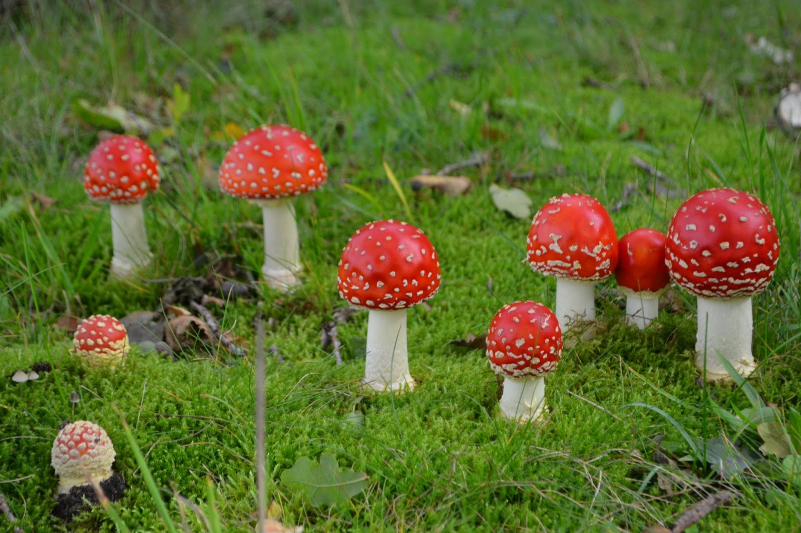 Op weg naar huis, zo tussen een vergadering, een boodschapje en een wasmachine door zag ik ze ineens. In een ooghoek. Zo mooi! Net alsof iemand ze geboetseerd had en zorgvuldig neergezet, vel afstekend tegen het knalgroene mos. Blijkbaar was al die regen ook nog ergens goed voor.