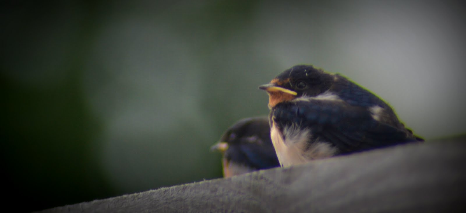 Aan de roodbruine keeltjes te zien zijn het boerenzwaluwen. Papa of mama voerde vervaarlijk snelle duikvluchten uit boven mijn hoofd toen ik zijn kroost op de foto zette. Duidelijk niet gediend van paparazzi.