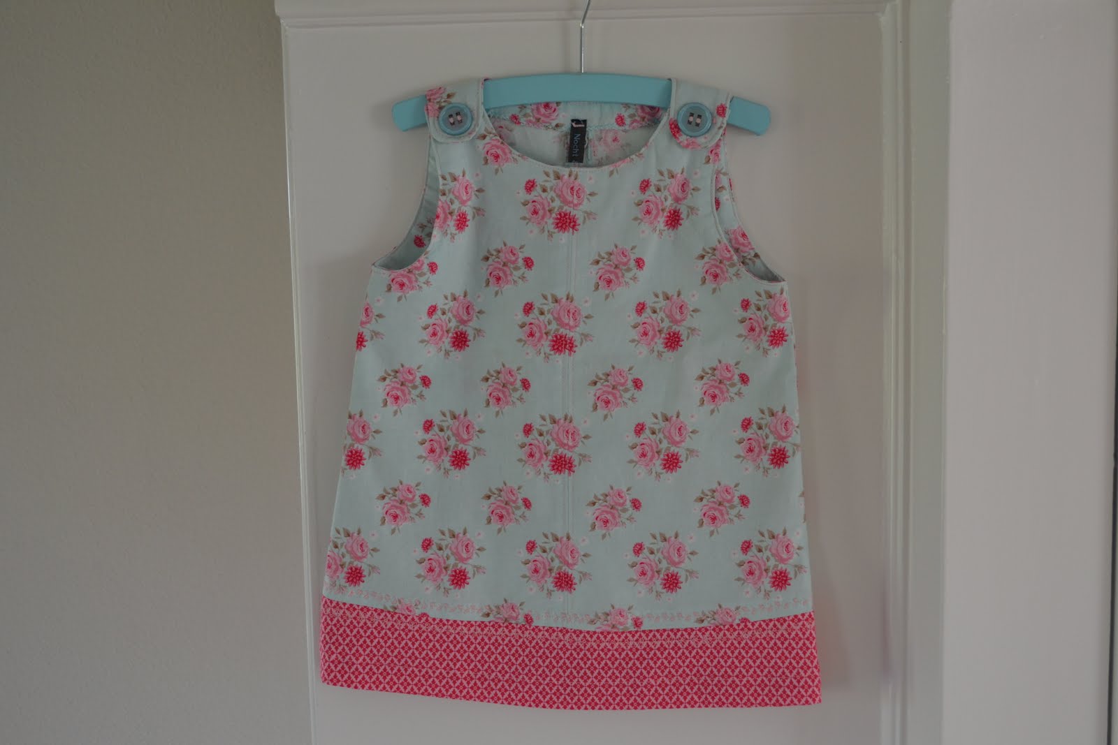 Mooie stofjes van Tilda, die ik bij Marutska kocht, en een patroontje uit de Knippie. Voor wie het wil weten, zoek ik gerust op welke. Nieuwe vaardigheden die ik oefende: knoopsgaten (4 x uitgehaald, ondanks zorgvuldig oefenen), knopen machinaal aanzetten (superontdekking! In één keer gelukt) en sierrandjes borduren.