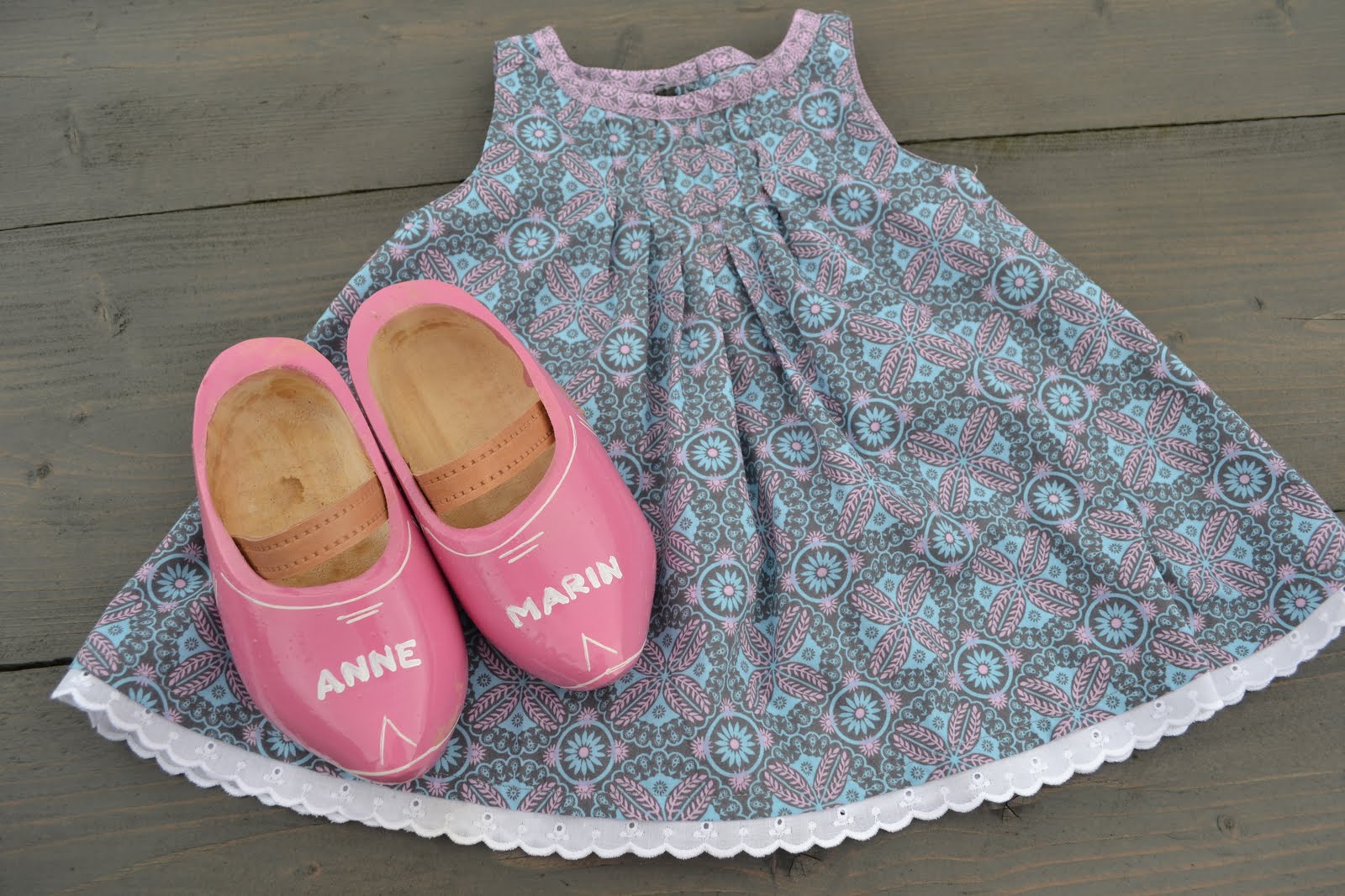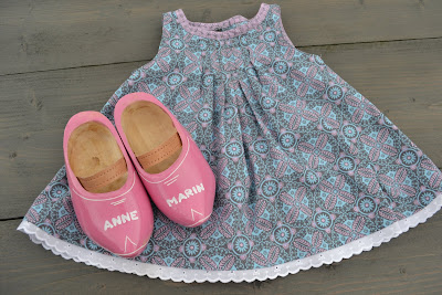 En ja! Daar was ze dan! Mijn twaalfde 'tantesizzer', zoals ze dat plegen te noemen. Een lief klein meisje van mijn broertje en mijn schone zuster. Handen uit de mouwen dus! En niet alleen voor mij, want traditiegetrouw bestelde ik een paar klompjes bij de plaatselijke klompmaker. Echte 'Scherjontsjes' dus. Ze kleuren mooi bij het jurkje dat ik maakte naar een patroontje uit de Knippie.