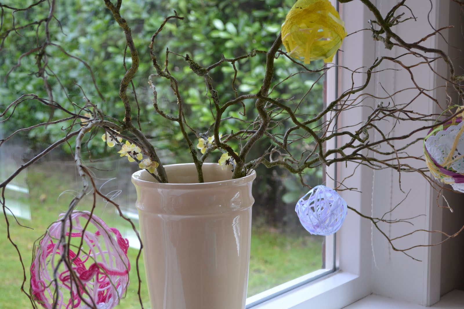 Onder het motto: 'beter goed gepikt dan slecht verzonnen' knutselde ik met de kids afgelopen vrijdag precies dezelfde soort paaseieren, als de kinderen van mijn school op hun creamiddag. Lekker kliederen met ballonnen, behangplaksel, lintjes, bandjes, kantjes. Het is even een geknoei (mijn oudste kan niet zo héél goed tegen vieze handen...) maar dan heb je ook wat! Een begin van de paasaankleding. Mijn kinderen en de oppas kennende, zullen de vensterbanken zich nog wel verder vullen..