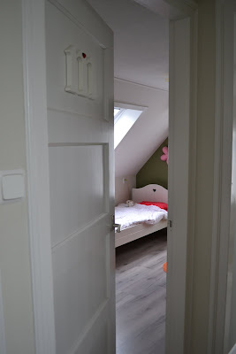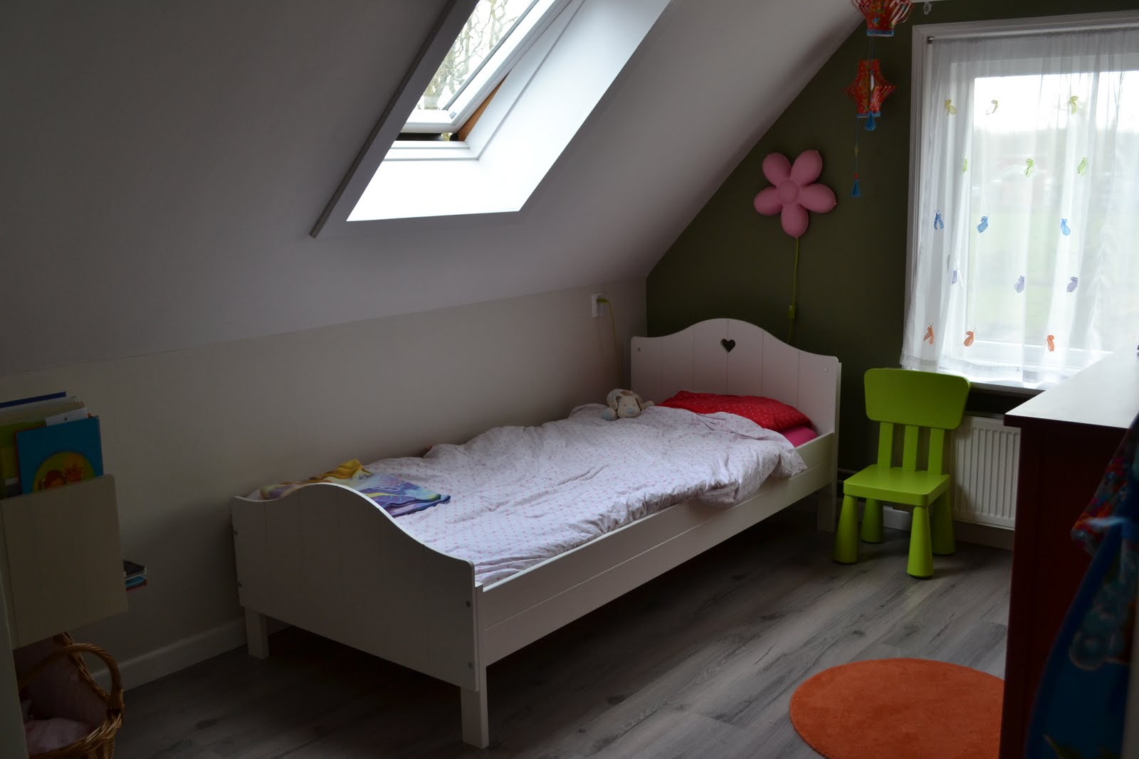 Achteraf nooit helemaal naar wens, omdat het allemaal net té licht en wat nietszeggend was. Mijn prinsesje werd intussen een robuuste peuterdame, die bovendien allergisch bleek te zijn voor bijna alles wat in de lucht hangt, waaronder huisstofmijt. Toen we de babykamer voor haar broertje gingen aanpakken, was dat dus een goed excuus om ook haar kamer van een mooie dichte laminaatvloer te voorzien, in plaats van de kierende vloerplanken de er lagen. En ja, toen moesten er nieuwe plinten op.. en ja.. toen konden we de boel eigenlijk ook wel opnieuw sausen. Dus is de prinsessenkamer nu stoer groen. Alweer een jaar of drie, nu. En het bevalt nog steeds. Ook bij de inwoonster zelf, want onlangs vroeg ze me om ook de andere muren groen te maken. En het plafond.