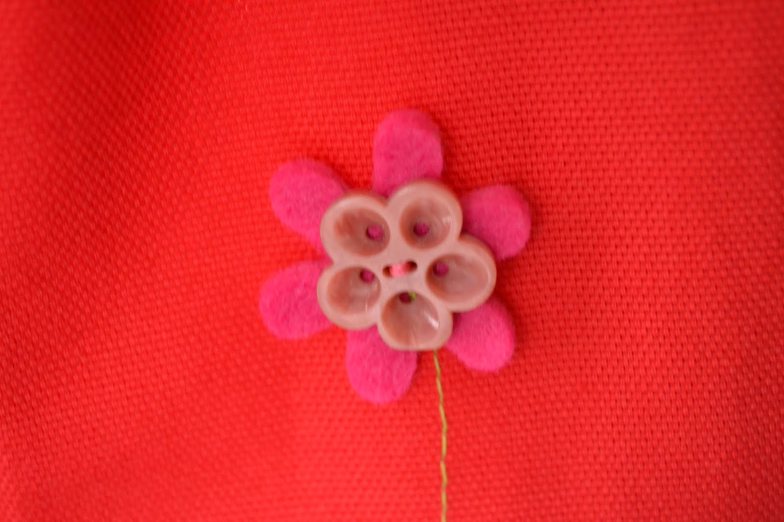 | Met vilten bloemetjes en blaadjes, en knopen uit beppes tromke, waaronder hele mooie! |