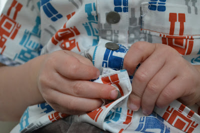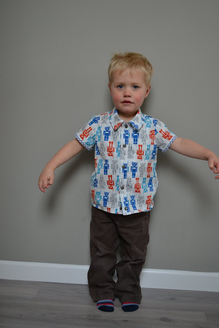 Vanuit deze robotliefde vatte ik het plan op om voor deze kleine grote man een robot-hemd te maken. Het stofje zou ooit een schooltas voor de oudste worden, maar dat werd er toch één uit de winkel (die natuurlijk stukken stoerder was...).