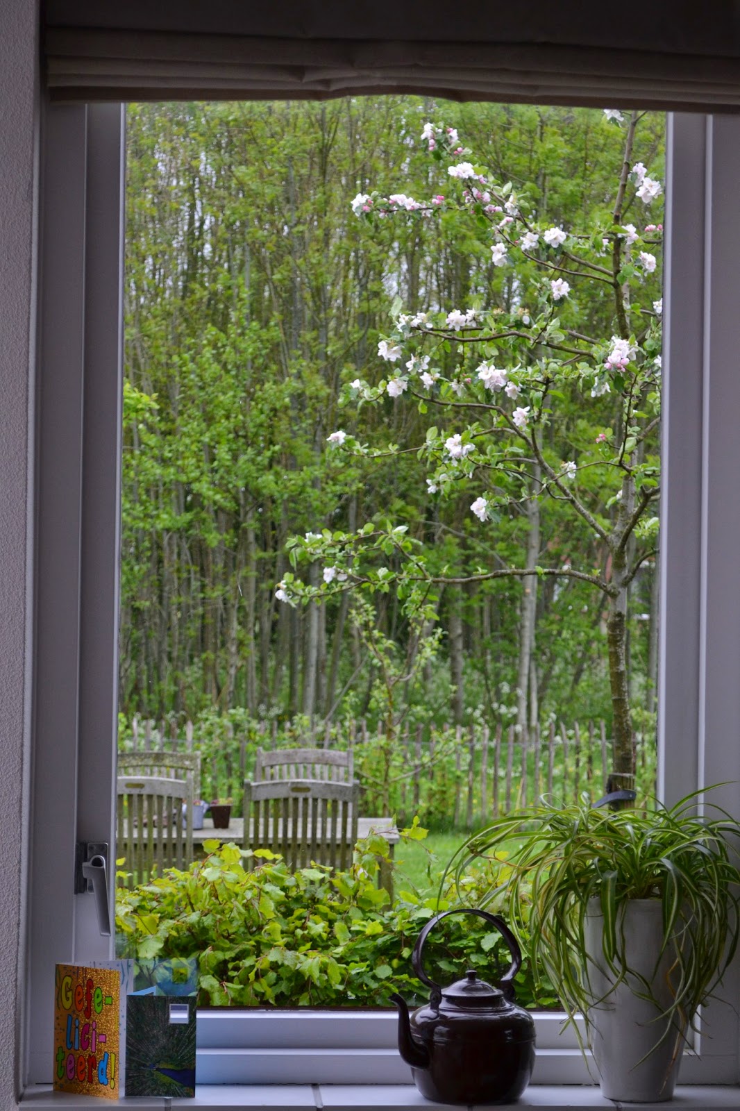 Het uitzicht.. nat, koud, maar groen! Ik zou zóó graag tussen de bloesem willen zitten met mijn kopje thee... zucht! De appelbloesem wint voorlopig de grote bloeiwedstrijd. Die van kers en pruim waren na een flinke regenbui verdwenen, maar vrijwel alle appelbomen (we hebben er vier) zitten nog vol rose-witte bloemen en knoppen. Zouden we dan dit jaar ook eindelijk eens appels van eigen boom kunnen eten?