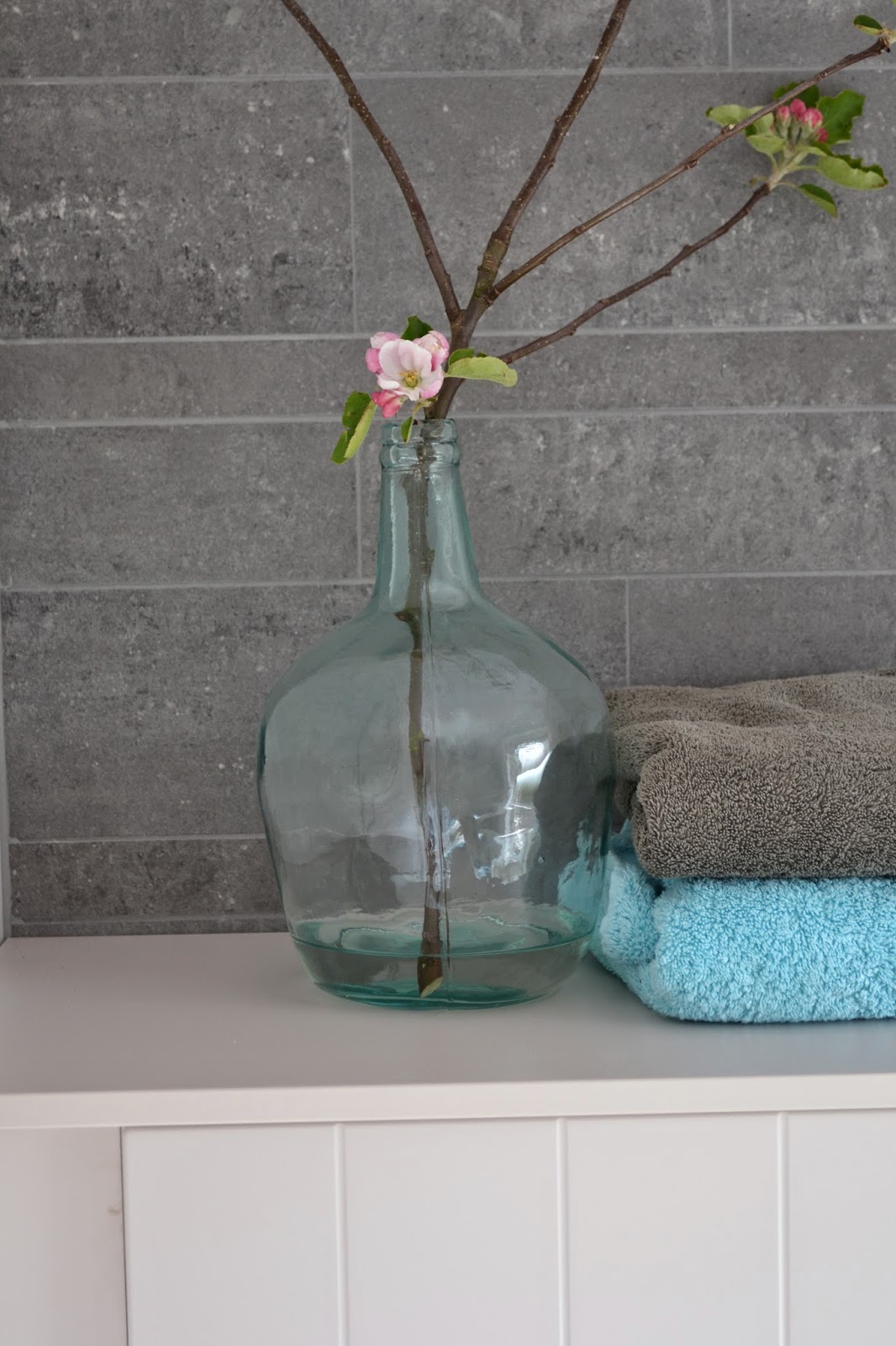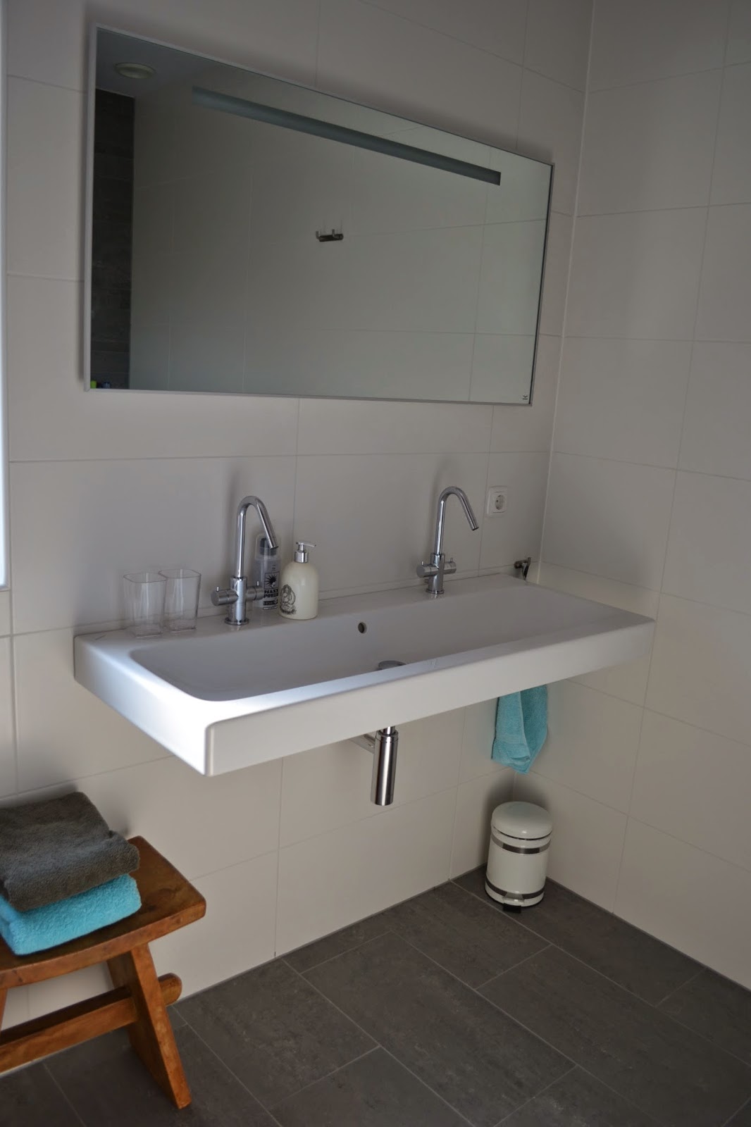 Een randje kit, en een paar schroeven. Dus nog niet helemaal in gebruik, deze badkamer. Maar daarom misschien juist wel mooi om te (laten) zien, zo zonder rondslingerende handdoeken of onderbroeken.